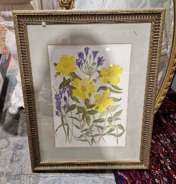 floral watercolour still life by Betty Bust, a firescreen with embossed brass floral and ship decoration, a print after Peter Scott, and a tin planter (8)