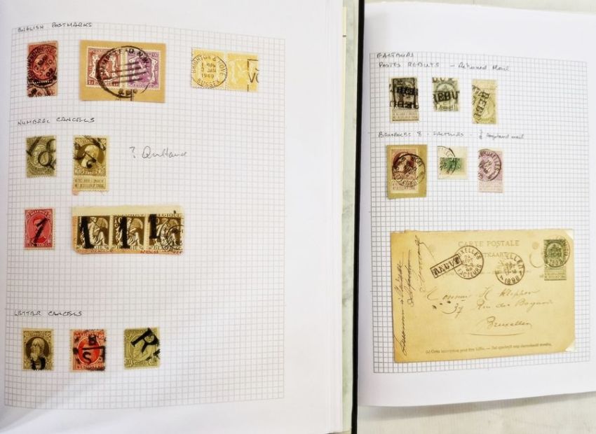 Belgium: postal service postmarks with others from late 1800's in 3 black Centinal albums with background papers in separate folder. Used on stamps, covers, postcards, banknotes, telegraph, coupon, response, advertisements, postal school, savings, aboard, express, newspaper delivery 'return to sender', 'ambulant'. High value issues to 2F (including cover) and scarcer counsels seen (1 box)From the collection of Tom Pring, a highly respected member of the Belgian Study Circle and the author of two works on Belgian issues, ‘Fine Barbe Varieties’ (2009) and ‘1893 Armoires du Royaume’ (2015). Pring was half-way through a work on the Ostend-Dover Route, which he was sadly unable to complete.