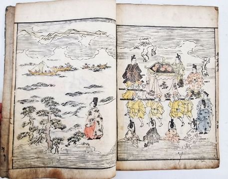 Two Japanese woodblock painting books, one with Japanese characters, script and flowers, the other various Japanese scenes with some watercolour paints (2)