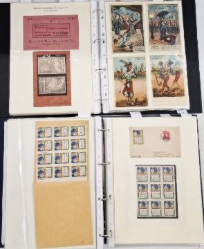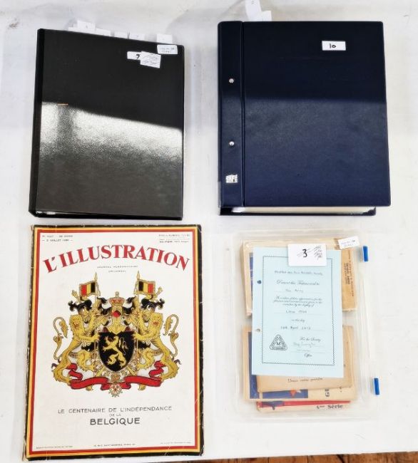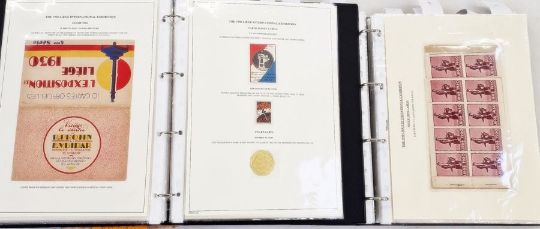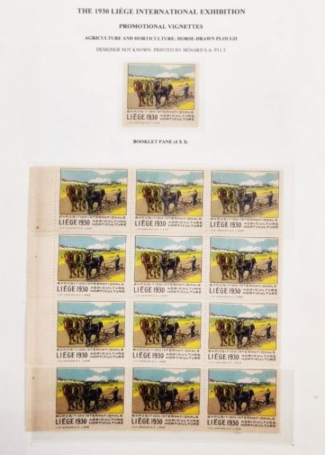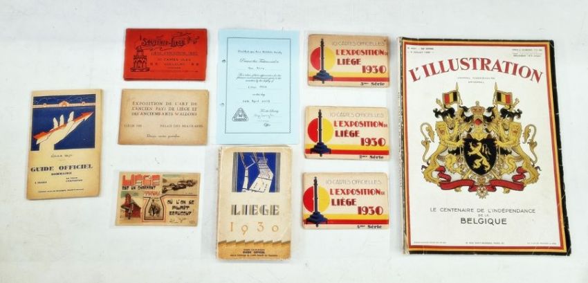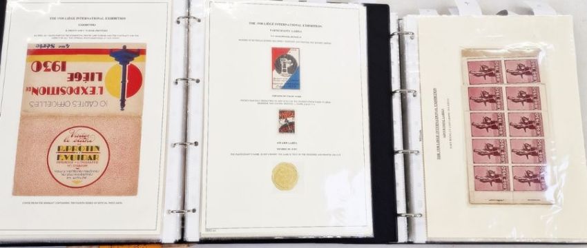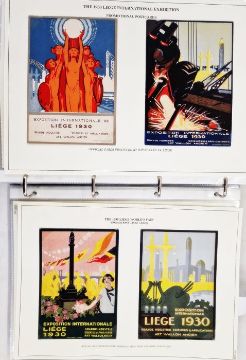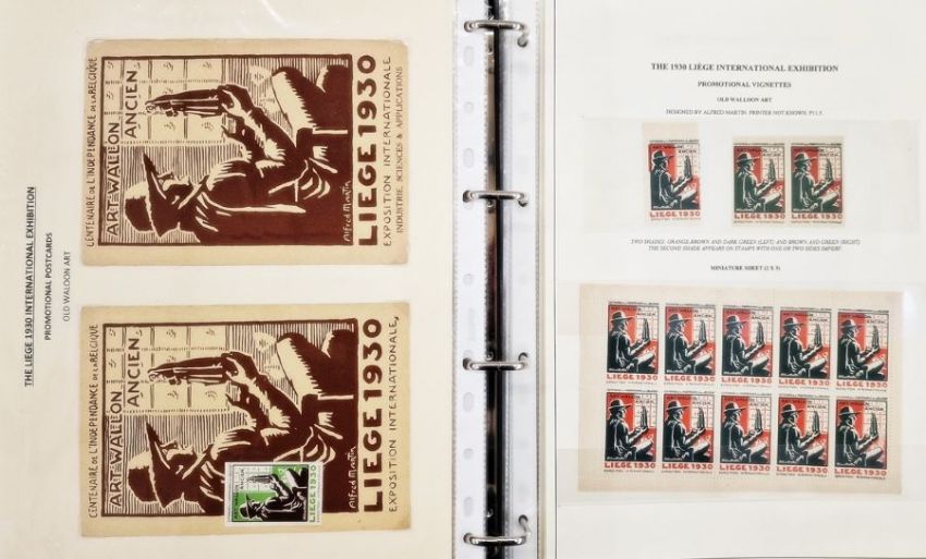 Belgium: Liege World Fair Exposition 1930 collection in dark blue, large, sleeved folder, a black folder, a plastic case and with ‘L’Illustration’ journal for centenary of independence that year. Mint and used, definitives and commemoratives on postcard, promotional and official covers, some with inspector marks. Much other promotional and related items including many Expo cinderellas, some in complete and partial booklets with sets of vignettes, advert/judge’s labels and stickers, trade cards, miniature sheets along with abonnements (season tickets), souvenir badge, maps, brochures, leaflets and guides. Numerous postcards of the event and site including many by Marco. Artwork piece by Paul Tonelli. Comprehensive range and well presented. (1 box)From the collection of Tom Pring, a highly respected member of the Belgian Study Circle and the author of two works on Belgian issues, ‘Fine Barbe Varieties’ (2009) and ‘1893 Armoires du Royaume’ (2015). Pring was half-way through a work on the Ostend-Dover Route, which he was sadly unable to complete.