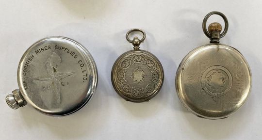 Three silver watches, W.E. Watts Ltd., Nottingham, English lever in working order, lady's silver fob watch, J. A. & McCare Royal Exchange, London, not working, glass missing together with second hands (4)