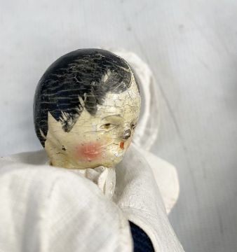 Two possibly German peg dolls, male and female, the male with gold coloured buttons on a brown suit and shoes and female with blue dress, removeable bonnet and apron, right arm loose but present, both with painted hair and faces, 31cm and 28cm (2)