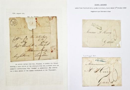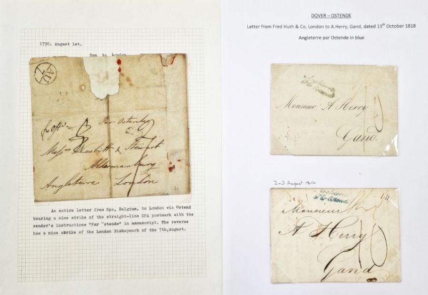 Belgium: cross-channel mail and postal history collection 1731 to 1946, in black folder, 70+ sleeves. Antwerp-Exeter entire 1731, Bishop mark cover Ostend to Margate and Spa to London 1786 and 1790 respectively, over 30 pre-stamp covers including 'Ship Letter' 'Apres le Depart' 'Allemagne German Chemin de Fer' (1846), early stamp issue covers through to 1946 centenary of Ostend-Dover mailboat service covers and stamp issue varieties (mint and used), GB QV Line engraved and and surface printed cards included. From the collection of Tom Pring, a highly respected member of the Belgian Study Circle and the author of two works on Belgian issues, ‘Fine Barbe Varieties’ (2009) and ‘1893 Armoires du Royaume’ (2015). Pring was half-way through a work on the Ostend-Dover Route, which he was sadly unable to complete.
