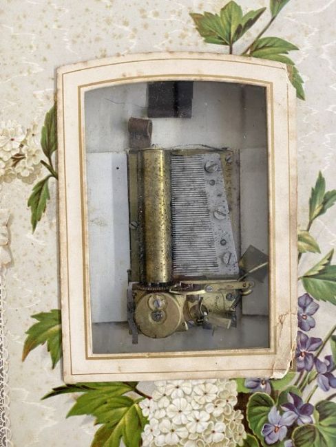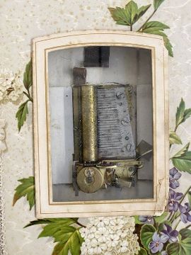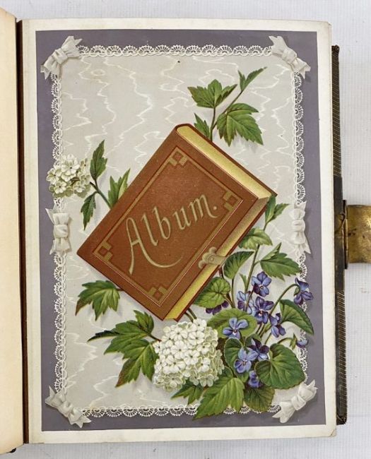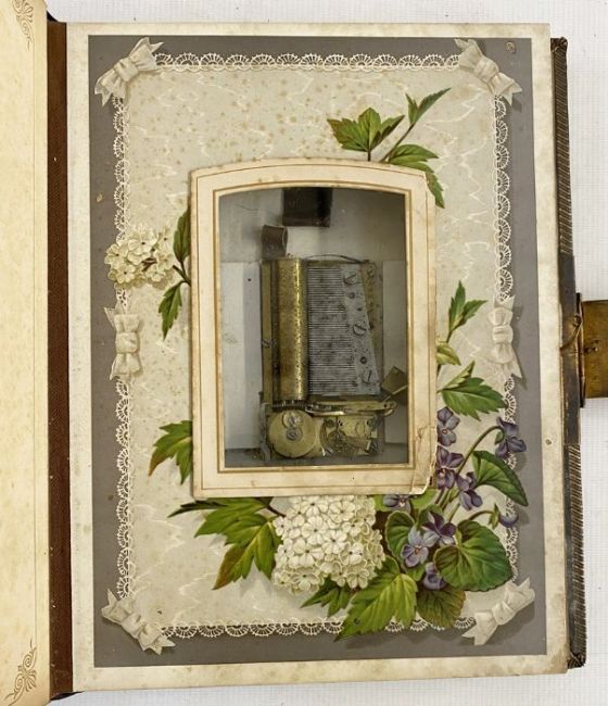 Victorian photograph album music box, the pages printed with decorative chromolithograph floral sprays around the apertures, brass clasp, with ring handled key, in gilt tooled and embossed leather cover, 6.5cm 30cm x 24cm