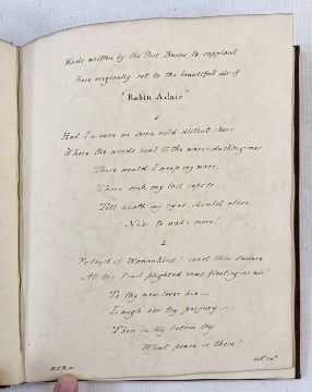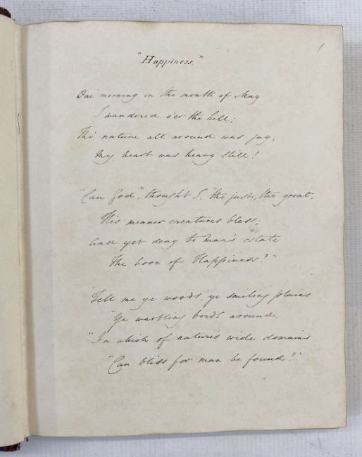 Early 19th century leatherbound journal filled with handwritten verses, copied from the likes of Bishop Heber, Sir Walter Scott, Spenser, Littleton, Felicia Hemans, Grahame, as well as an original verse titled 'Farewell' dated 1831. Inscribed to the front page 'Louisa, Ann, Sophia Harding. October III 1829', occasional pencil drawing, with loosely inserted letter. To the reverse, later pasted newspaper clippings in Italian and English being reviews of opera 'La Suocera' by F. M. Steward, dated 1877