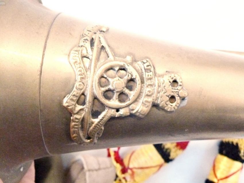 Brass bugle with Royal Artillery cap badge, three plaques, two with Scottish regimental cap badges and WWII child's gas mask