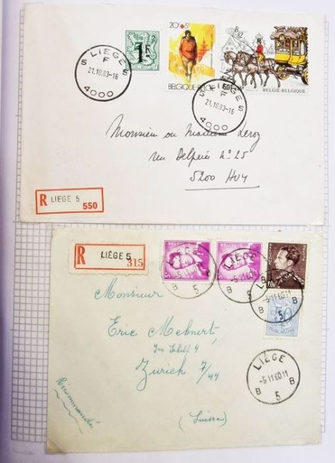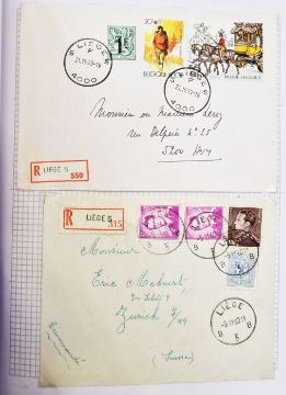 Belgium: Liege - related stamps and postal history 1860's in three red 'Simplex' albums. Various issues, covers including fdc, pre-paids and pre-cancels, registered, occupation, censor, postage due, promotional/commercial. Unusual Liege postcard to Ostend with 2c (arms), pair with bisect (5c rate) seen From the collection of Tom Pring, a highly respected member of the Belgian Study Circle and the author of two works on Belgian issues, ‘Fine Barbe Varieties’ (2009) and ‘1893 Armoires du Royaume’ (2015). Pring was half-way through a work on the Ostend-Dover Route, which he was sadly unable to complete.