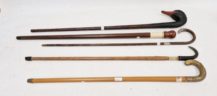Assorted walking sticks, one with a carved mallard head, another with a sheep horn (5)