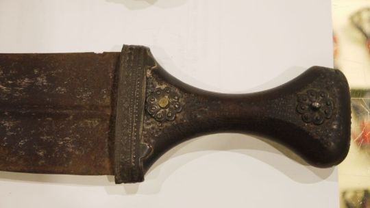 19th century ottoman/Indian horn powder flask with metal collar and lid, 4cm long (damaged) and a 19th century jambiya with wooden sheath and metal embossed handle, 31cm long (2) Condition ReportReport request: Additional photos (only)