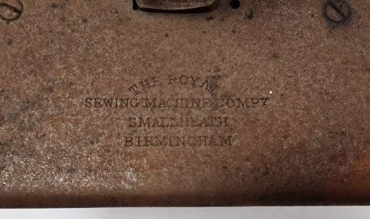 Late 19th century 'Shakespeare' sewing machine by the Royal Sewing Machine Company, Birmingham, on mahogany base with maker's plaque, 28cm high