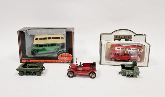 Exclusive First editions 26301 Guy Arab II utility bus London Transport, Days Gone 41013 1928 Karrier E6 Trolley Bus Colmans Mustard, two playworn dinky models to include 162a Light Dragon Tractor, 151c Military Army Field Kitchen trailer and a loose Model of Yesteryear No. Y-1 (5)