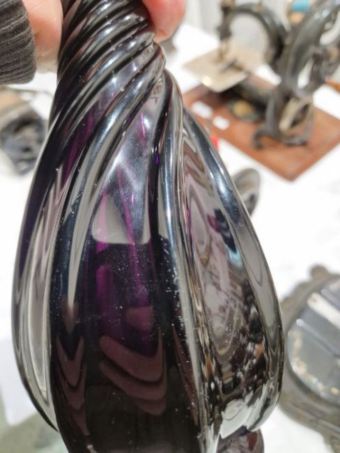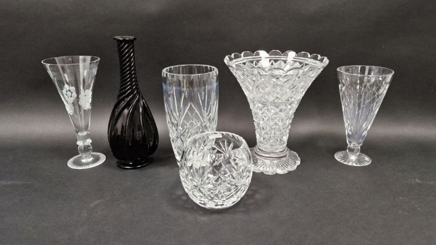 Amethyst decanter with surface scratches and accretions, no stopper. Large cut glass vase with some nibbles, light clouding to one vase. all with general wear and tear, see photos.