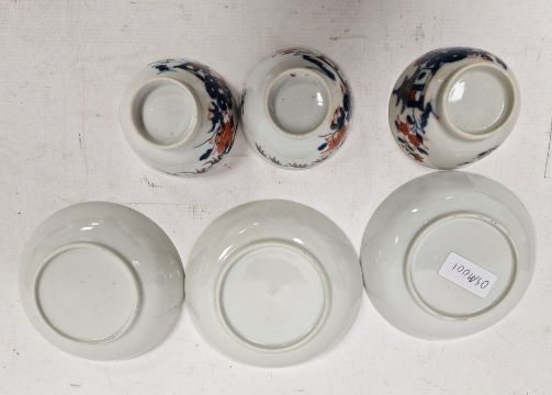 Three matched Japanese Imari pattern tea bowls and saucers, each with decoration depicting pagodas amongst scrolling foliage