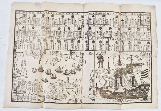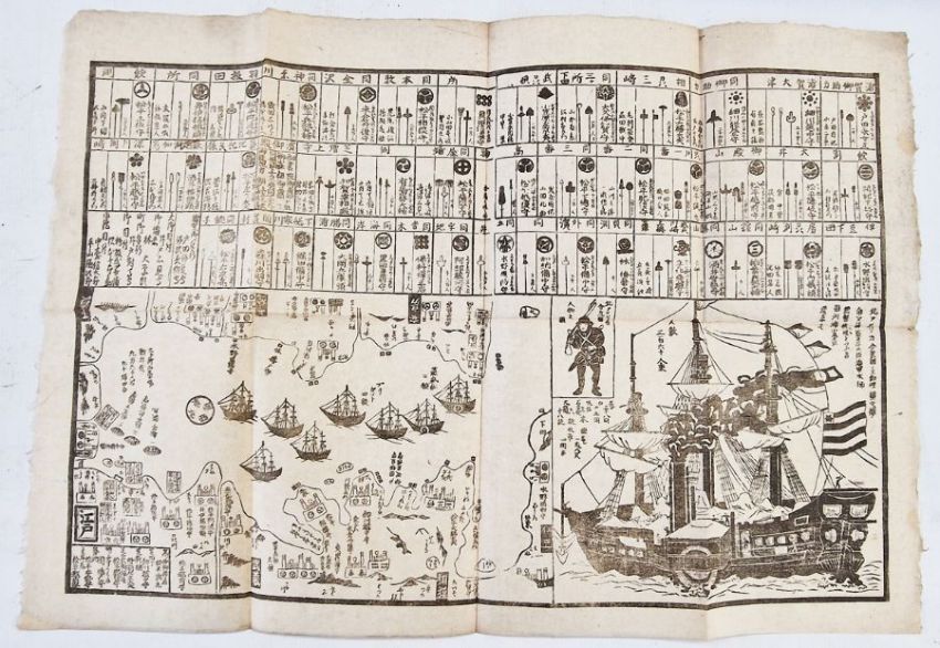 Commodore Matthew C. Perry - Broadsheet/ Kawaraban  woodblock print showing the visit of Perry's second visit to Japan in 1854. 42cm x 60cmThe expedition was commanded by Commodore Matthew Calbraith Perry, under orders from President Millard Fillmore. Perry's primary goal was to force an end to Japan's 220-year-old policy of isolation and to open Japanese ports to American trade, through the use of gunboat diplomacy if necessary. The Perry Expedition led directly to the establishment of diplomatic relations between Japan and the western Great Powers, and eventually to the collapse of the ruling Tokugawa shogunate and the restoration of the Emperor.