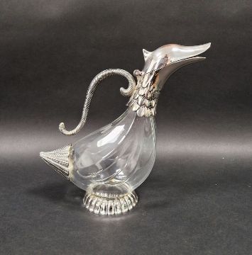 Early 20th century silver-plated and glass duck carafe, 25cm high approx.