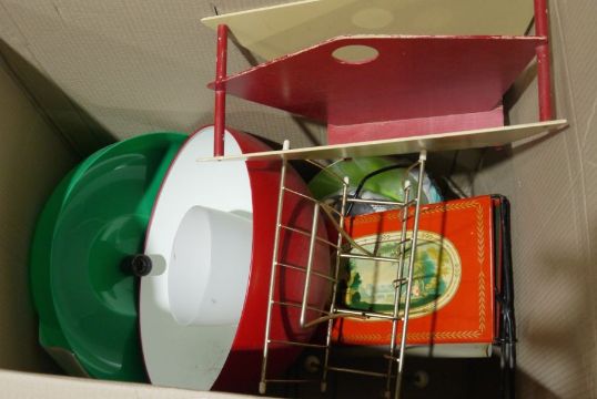 Two vintage atomic-style magazine racks, a vintage wooden Haxyes magazine rack, a wicker basket, a vintage coat rack and assorted ceiling light shades (1 box)