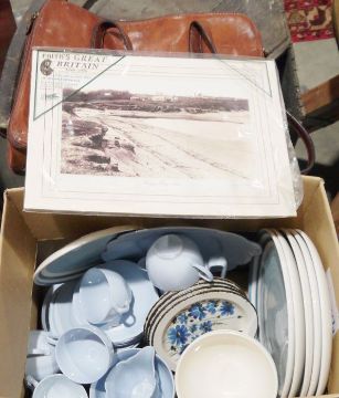 Cosmic 35 camera, a small quantity of wooden children's doll house furniture, a vintage leather satchel, assorted small wooden picture frames, a copper bedpan and assorted chinaware, metalware and wooden items (4 boxes)