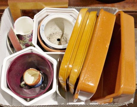 Tiffany-style lampshade, a John Bordeaux pottery model of a wren, a set of six Lamorna soup bowls, a Pink Panther model by United Artists, a small Portmeirion lidded storage jar and further assorted china and glassware (4 boxes)