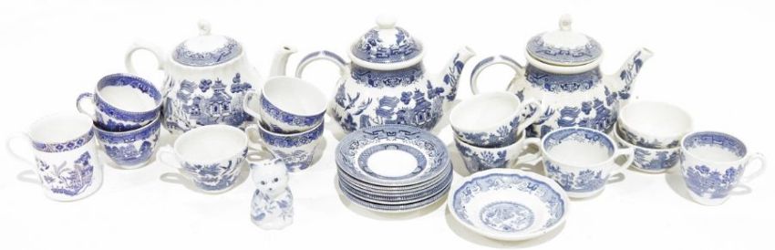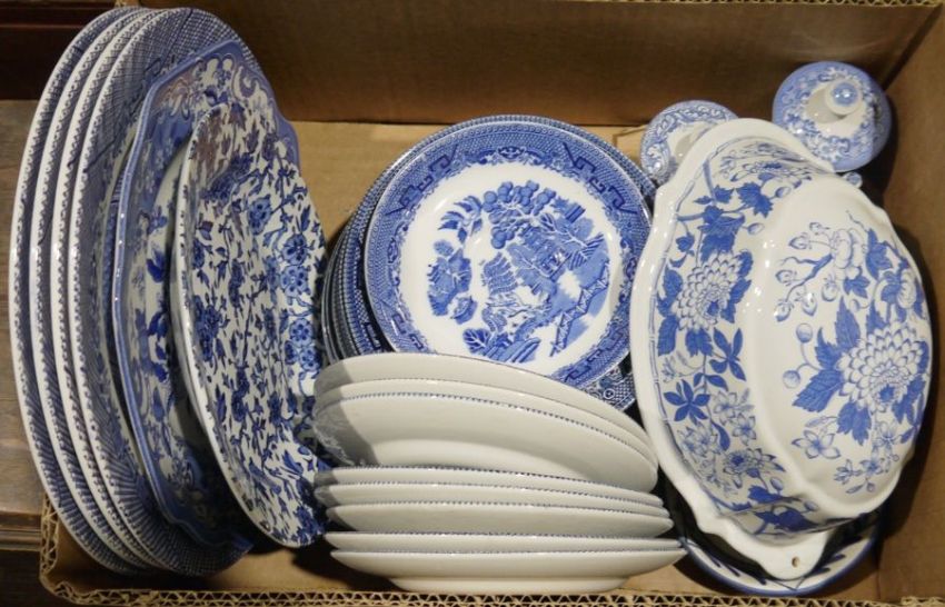 Large quantity of blue and white china to include Churchill, Spode, etc. (5 boxes)