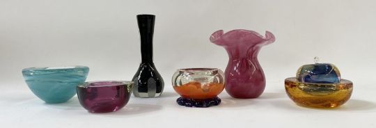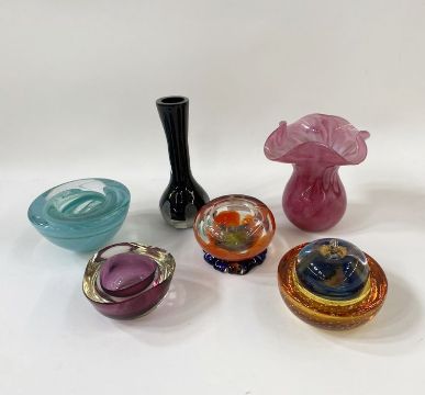 Anna Ehrner (b.1948) for Kosta Boda 'Atoll' bowl in aqua blue colourway, etched mark to base and with original label, height 6.5cm, a small Murano cased purple glass triangular geode bowl, an Adrian Sankey glass paperweight in the form of an apple, a Whitefriars glass bowl in orange colourway with internal air bubbles, a Mtarfa glass vase and a glass ashtray (6)