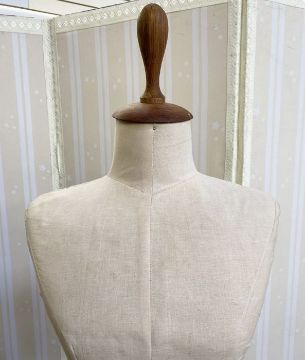 Modern dress mannequin of half-torso, on adjustable wooden tripod stand, with a label attached 'Parlane International', the bodice covered in fabric