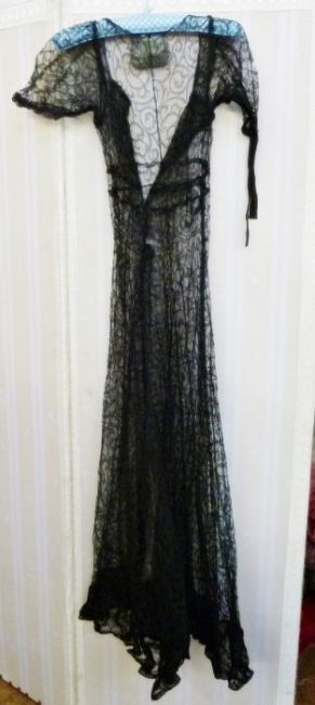 A 1930's black lace bias cut evening dress capped sleeves with ribbon ties, no underslip (1)