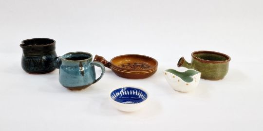 Godshill stoneware pottery side handled jug another in green, Godshill small brown skillet, Hornsea tricorn dish, Moss Pentewan small blue fish dish, a small blue jug (marked ?? 81) and a pottery vase with pierced rim and tubline mesh decoration