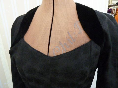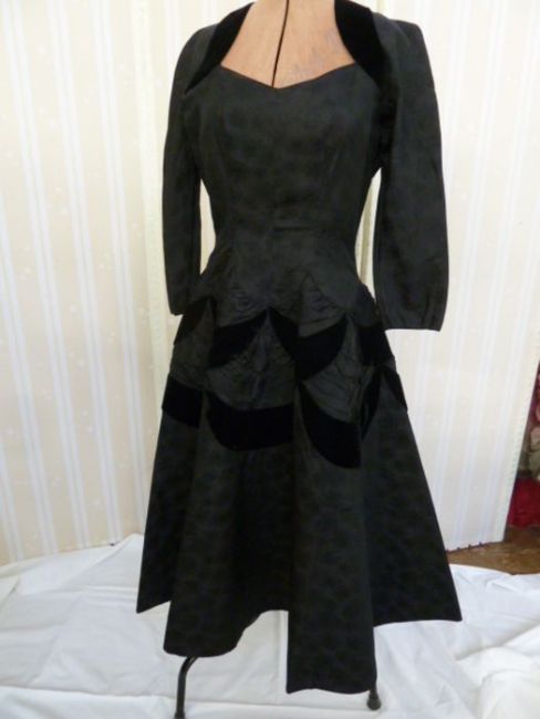 Couture 1950's black printed satin evening /cocktail dress, full circle skirt, lined with stiffening, sweetheart neckline, drop waist, black velvet swags to the skirt and black velvet detail to the shoulders, three quarter length sleevesCondition ReportApproximate size 10 - smallThe dress is near perfect - obviously it has age . The velvet and the fabric in good order
