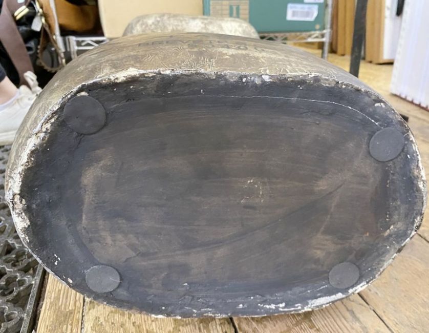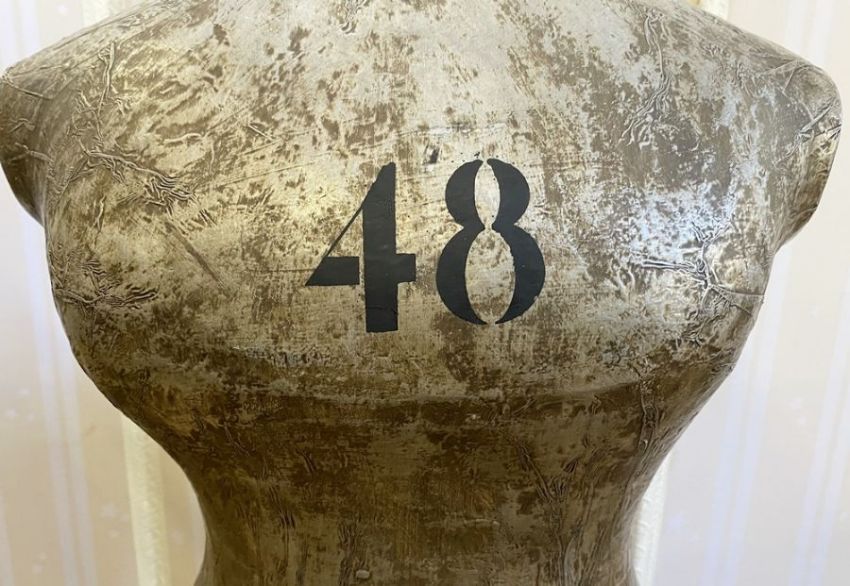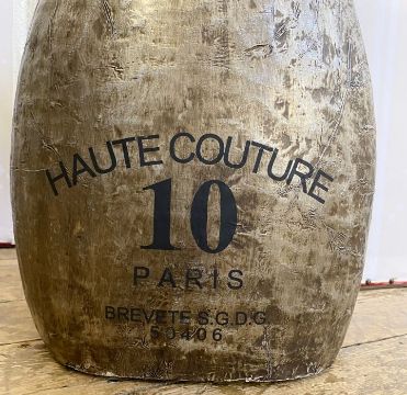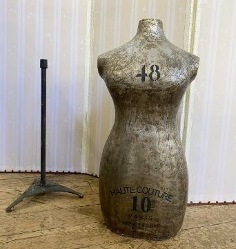 Antique dress mannequin, marked 'Haute Couture 10 Paris brevete S.G.D.G. 50406', has been silvered, possibly covered with papiermache, in natural form and has no.48 on the bust, 82cm high, may be plaster of Paris, and a tripod stand not matching the bust mannequin (2)