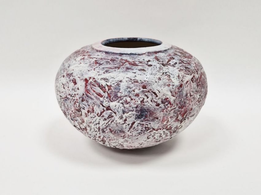 Philip Evans (b.1959) a stoneware collared vase of spherical form with textured surface covered in white and red glaze, incised signature to base, height 12cm