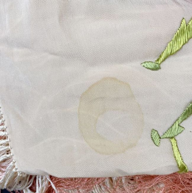 Oriental floral embroidered cream short tasselled shawl, rose decorated with peach and cream fringing, 120cm square approx. (without fringing)