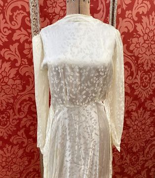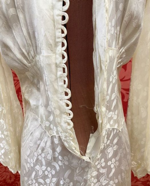 A 1940's figured satin wedding dress, loop and button fastening, buttons are missing, bias cut with a train