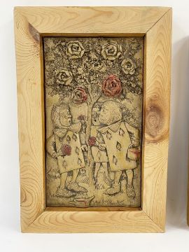 Hugh Boyles (contemporary) Two studio pottery tiles/plaques with relief decoration depicting scenes from Alice in Wonderland, housed in wooden frames, incised signature to both, tile measurements, 24.5cm x 14cm; 22cm x 13cm (2)