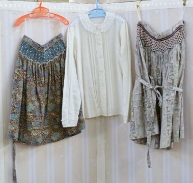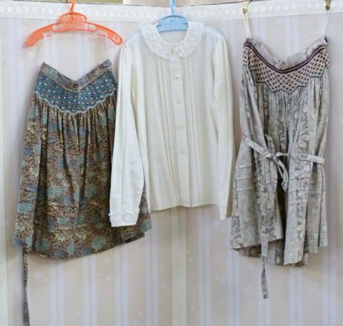 Various children's  and older girls skirts in Liberty print fabrics with hand smocked detail to the waistbands, varying ages, and two poplin shirts with crocheted collar and cuffs on one and embroidered collar on the other (7)  PLEASE NOTE THERE ARE NOW 8 IN THIS LOT