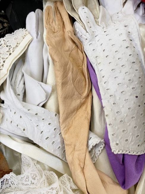 Assorted vintage items to include a Victorian black shawl with silkscreen printed decoration, a quantity of evening gloves, an embroidered black velvet cummerbund, various hats, a 1970's Bermona Trend linen cap, a Laura Ashley wool hat, a vintage ermine cape, a modern reproduction Victorian bonnet in Liberty fabric, a quilted bed jacket, a vintage bikini, an alpaca poncho and a large piece of faux-fur being an original late Victorian carriage rug for putting over your knees when travelling (2 boxes)