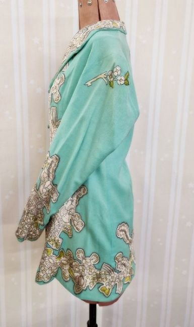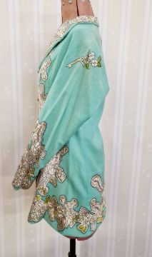 A 1920's/30's turquoise wool 3/4 length jacket, applied embroidery, lined in blue cotton, approximate modern size 8-10Condition ReportMeasurements from shoulder to shoulder approx 37cm.  Armpit to armpit approx 47cm.  Length of sleeve from shoulder seam approx 55cm and length of waist from shoulder seam approx 72cm.Please images of seams uner the arms, and slight stain on the back of the lining and the coat. The embroidery is good.