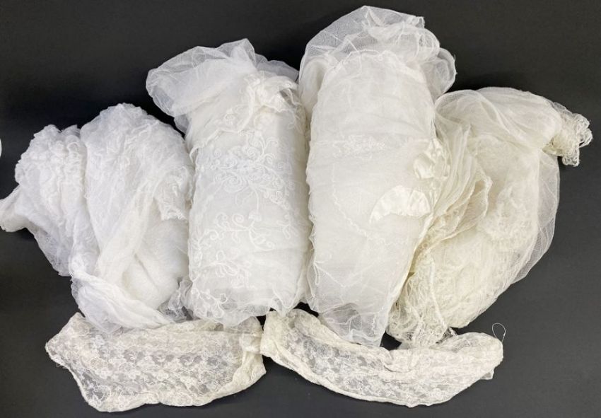 The majority of the veils have holes in, four with not many, one with a large hole and various small and one very badly damaged with holes. One veil the hem stitching is coming loose.