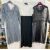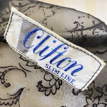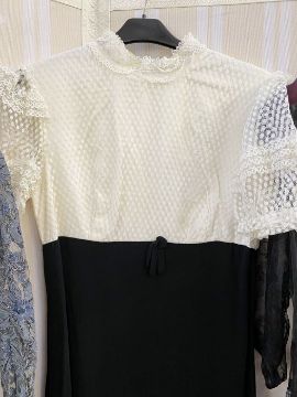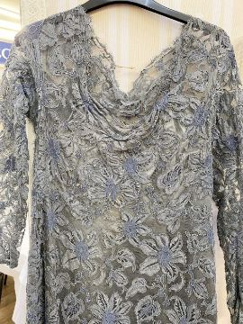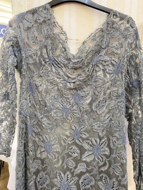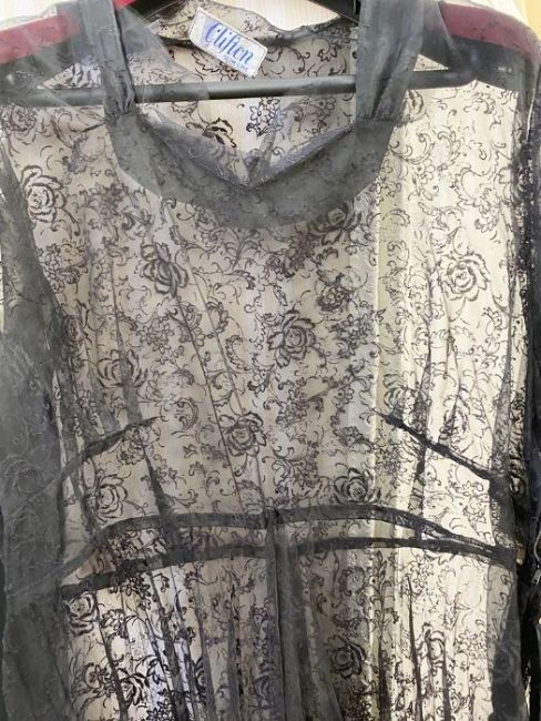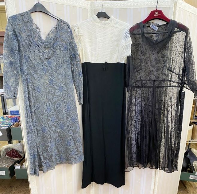 A 1970's maxi dress, empire line, navy blue skirt with lace bodice, puff sleeves and mandarin collar, a vintage possibly 1950's grey lace on net dress, back zip and under slip, and a black nylon dress labelled Clifton slimline (which would need a slip beneath), cut velvet detail