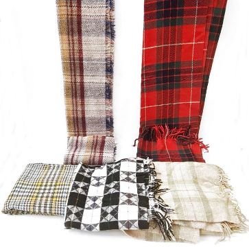 Two pairs of full length vintage linen curtains printed with hydrangeas and poppies lined and inter-lined, assorted vintage red satin fabric and curtains, four Welsh style blankets and assorted vintage linens (3 boxes)