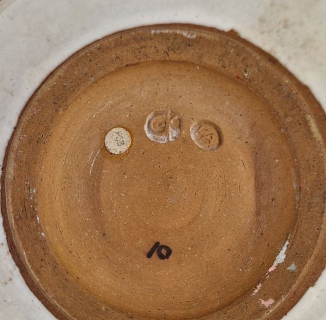 Marianne de Trey (1913-2016) studio pottery bowl, celadon glaze with fluted exterior, impressed mark to base, height 11cm, diameter 27.5cm (with repair), together with Chris Harries (1901-1971) studio pottery bowl, speckled ash glaze with wax resist decoration, impressed marks to base, height 12.5cm, diameter 28cm (2)
