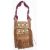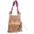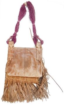 African embroidered leather and tasselled bag with purple stranded handle, the bag panels with tasselled embossed medallions, woven plaited and tassel decoration