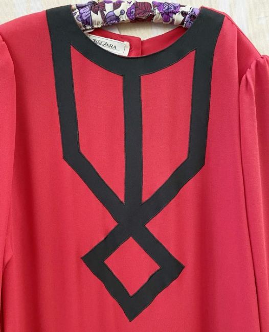 1980's drop waist dress, red with black detail labelled Balzara size 10, and a silk Venetski navy blue dress with cream fish design, 3/4 length sleeves (2)