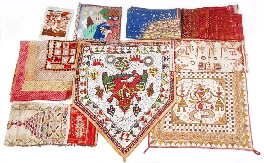 Mica Indian panels, beaded Ganesh panel, embroidered panel, South American panels and two linen cloths (1 box)