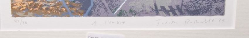 Judith Rothchild (American) Limited edition silkscreen print 'A L'Ombre', chair beside sun dappled wall, 43/80, signed and labelled in pencil and dated '87, 16.5cm x 22.5cm