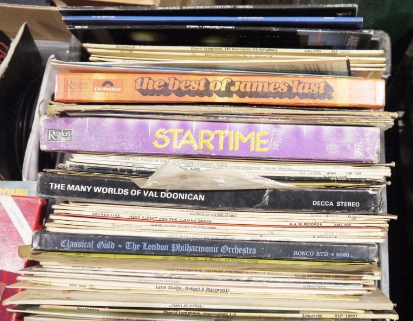 Large collection of vinyl LPs in four boxes, mainly classical, compilations, easy listening and film scores and a small quantity of 45s