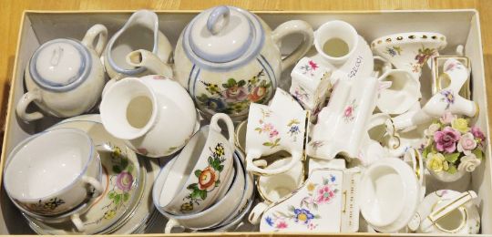 Quantity of Hammersley miniature ceramics to include grand piano, grandfather clock, miniature shaving mug, an Aynsley 'Cottage Garden' posy vase, Coalport 'Rose Garden' posy vase, Crown Staffordshire miniature chaise longue, Hammersley iron, shoe, etc, quantity of blue and white ceramics to include marked Canton, an early 19th century biscuit barrel, an early 19th century cheese dish, two large conch shells, etc (3 boxes)