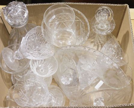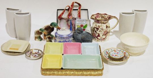 Scandinavian ceramic bell labelled Jule Christmas 1982, Weihnachten Noel, assorted ceramics to include dishes handpainted in Poland, a large mixing bowl marked 'Jacks Farm' by Ulster Ceramics, Masons Ironstone jug, a blue and white lidded pot, Beswick-style ornamental ducks, white wall pockets, mid 20th century hors d'oeuvres dish with different coloured dishes held within a wicker basket and assorted glassware to include decanters, wines, vase, fruit bowl, etc (3 boxes)