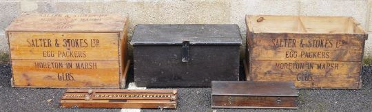 Two wooden lidded crates marked 'Salter & Stokes Ltd, Moreton in Marsh Egg Packers, Glos' and 'Yonder Hill Saw Mills, London', 38cm high x 33cm deep x 20cm wide, a black stained tool chest, a snooker score board and another small box (5)