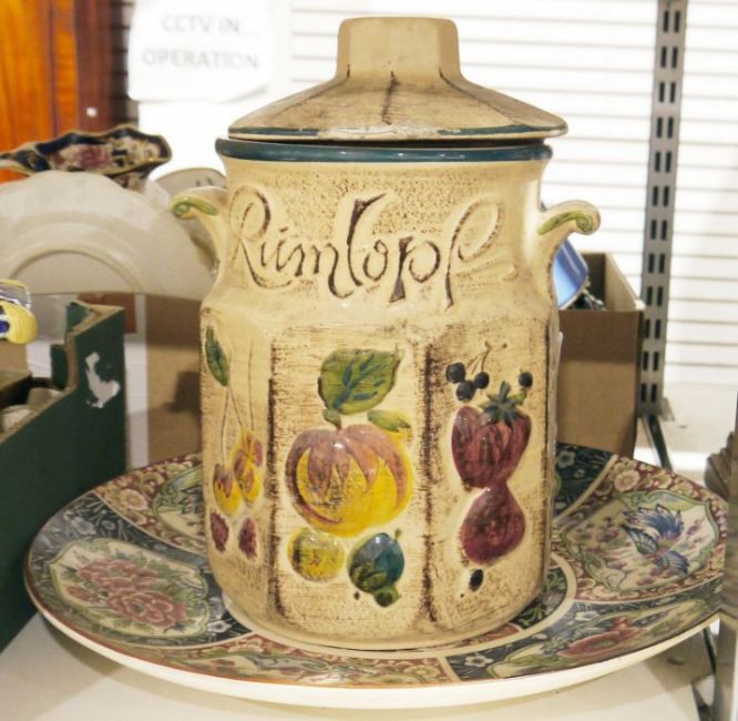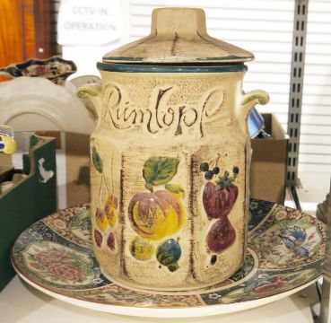 Rumtopf, large Asian-style platter, a Rutherfords Oldest Blended Scotch whisky bottle decorated with pheasants (empty), a sewing box, assorted ceramics, egg holder, assorted ornamentsa mid century jug and other items (3 boxes plus)