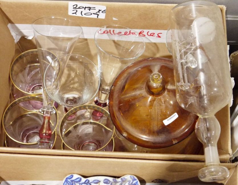 Six boxes of glass, ceramics and collectables including 'Bohemia' Czech part dinner service, trumpet-shaped wines, binoculars, treen, etc (6)